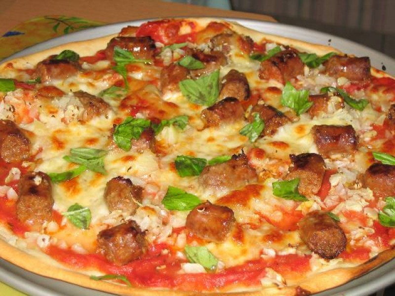 Sauce tomate, cantal (AOC), merguez, poivrons frais du marché, olives