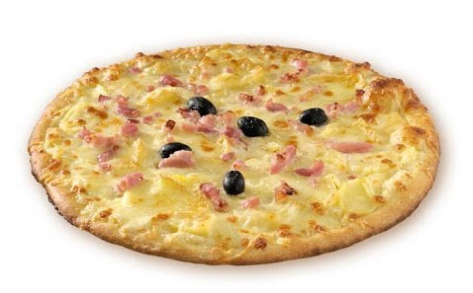 Sauce tomate, cantal (AOC), lardons, supérieurs, pommes de terre, reblochon, crème fraiche, origan, olives