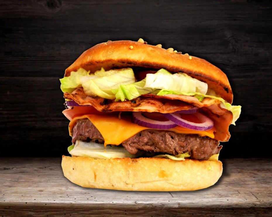 Pain artisanal Pierre BOUR, 150 gr steack de bœuf france, cheddar affiné, bacon, sauce BBQ, salade iceberg, tomate, oignons frais, cornichons