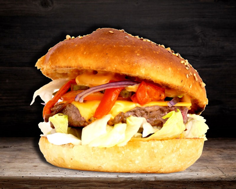 Pain artisanal Pierre BOUR, 150 gr steack de bœuf france, sauce pili-pili, sauce samourai, poivrons cuits au feu de bois, salade iceberg, tomate, oignons frais, cornichons