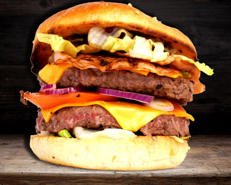 Pain atisanal Pierre BOUR, 2 steack 150 gr de bœuf france, 2 tranches de cheddar affiné, Bacon, sauce BBQ, salade iceberg, tomate fraîche, oignons frais, cornichons