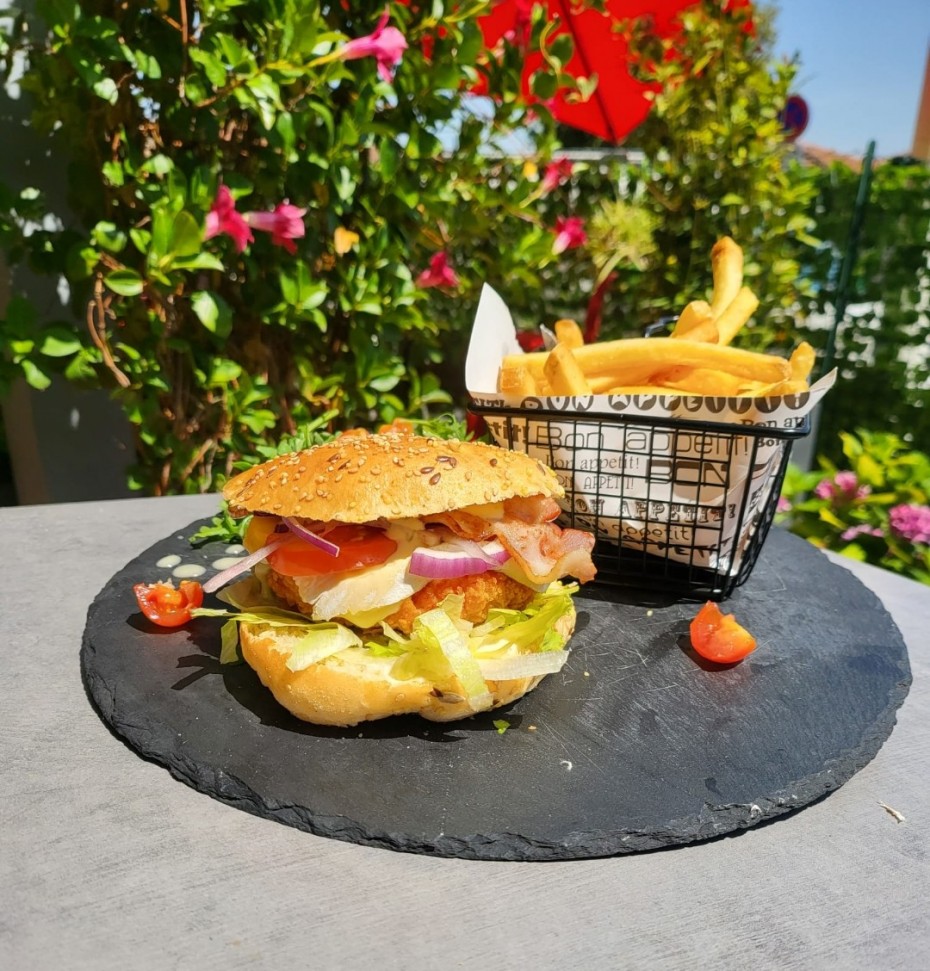 Pain artisanal Pierre BOUR, sauce blanche, tomate ,cornichon ,oignons rouge,salade, reblochon, filet de poulet crunchy 150g, bacon