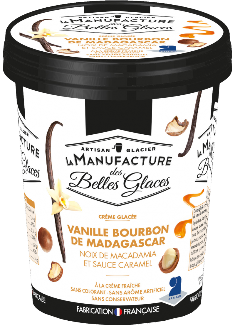 GLACE VANILLE BOURBON, NOIX MACADAMIA ET SAUCE CARAMEL, SANS COLORANT, SANS AROMES ARTIFICIEL, SANS CONSERVATEUR